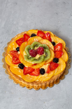 Shortbread tart filled with custard and covered with fresh mixed fruit.